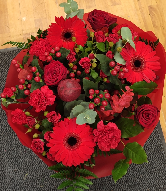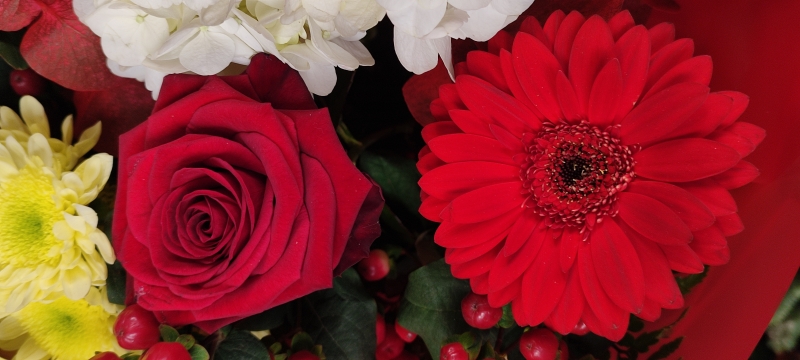 Festive and rich selection of fresh flowers composition arranged in a presentation box and finished with a Christmas bow.