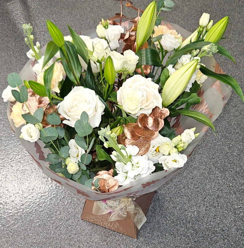 Carefully selected classy white blooms arranged with festive greenery and scented eucalyptus.